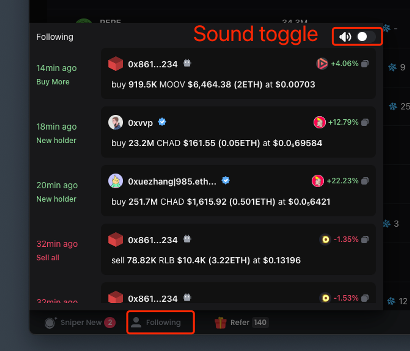 2. Receive notifications in the bottom left corner to track what smart money is buying in real time.