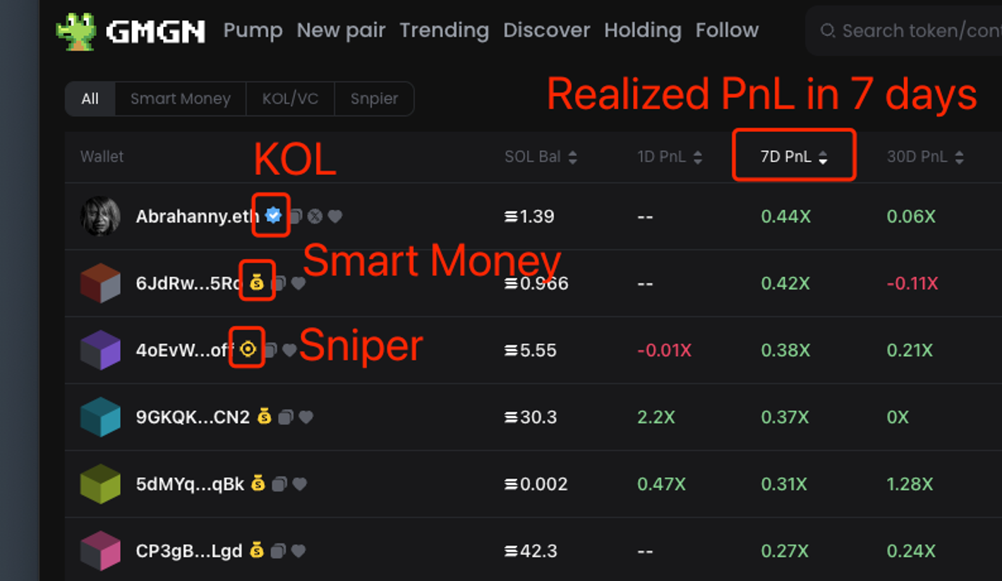 GMGN has big data on smart money, after follow smart money, you can receive real-time trading dynamics of smart money. Especially with the release of the new meme coin,there is a concentrated entry of smart money.